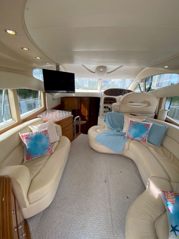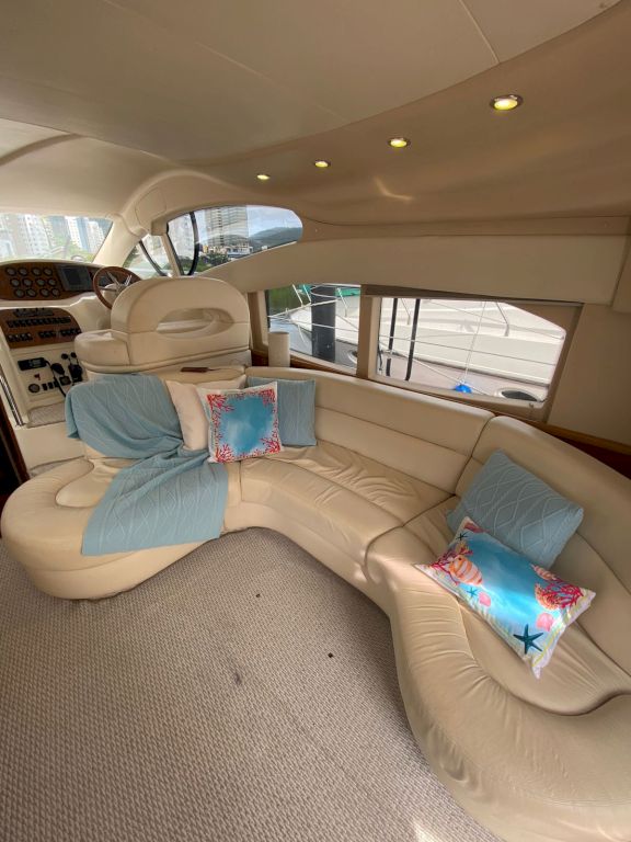 Cheia de classe, a Azimut "Brasileira" traz a presença de uma mobília em madeira, uma espaçosa praça e tudo que se pode desejar numa lancha tropicalmente completa.