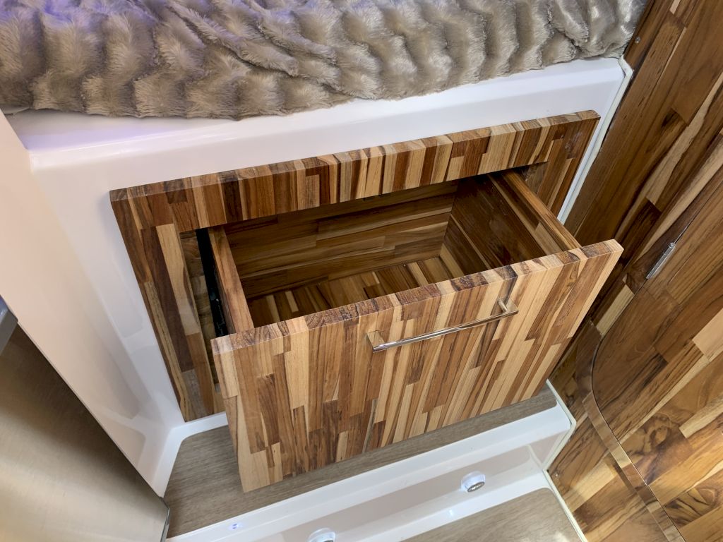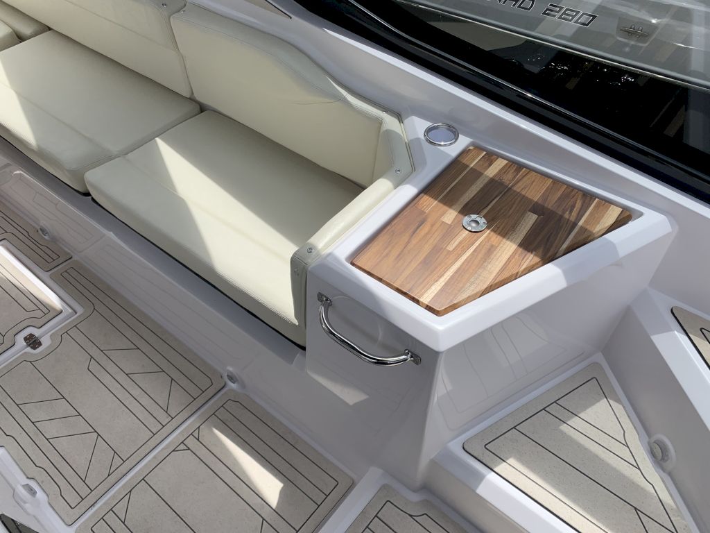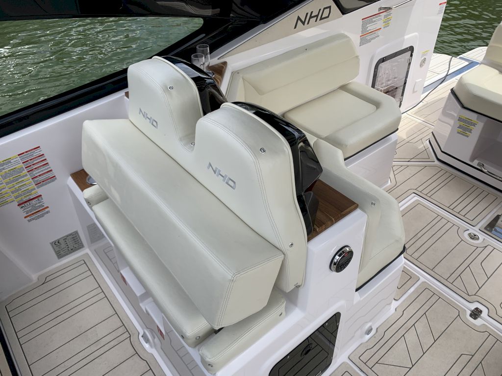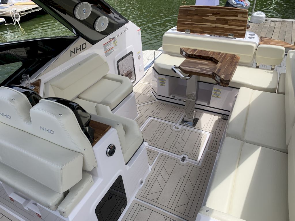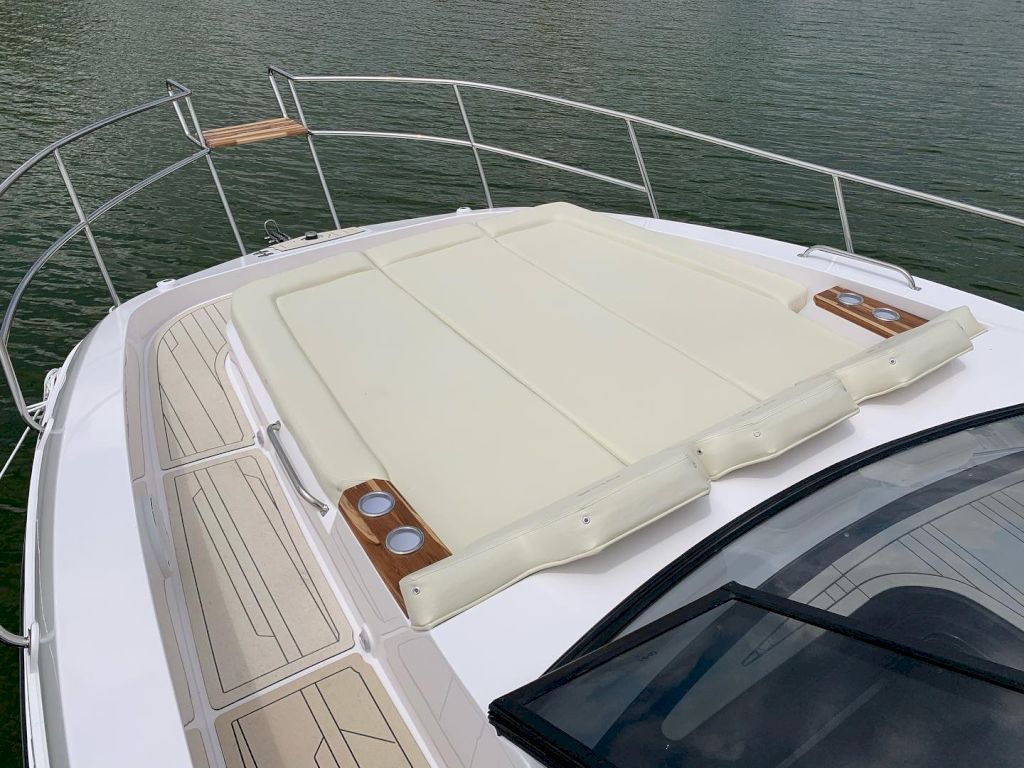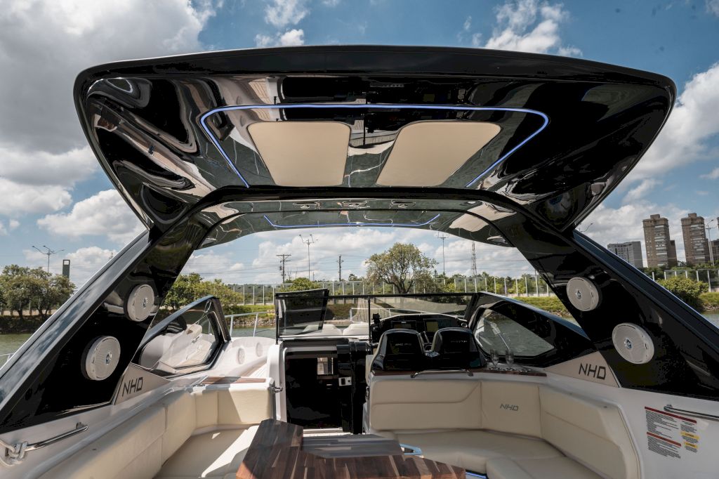 O Modelo conta com uma proa aberta, cabine com cama de proa e meia nau, cockpit amplo e espaçoso para uma excelente interação entre os passageiros, nichos para armazenamento de equipamentos, mantimentos e bebidas, plataforma de popa com Double Open Deck e um espaço gourmet de série.